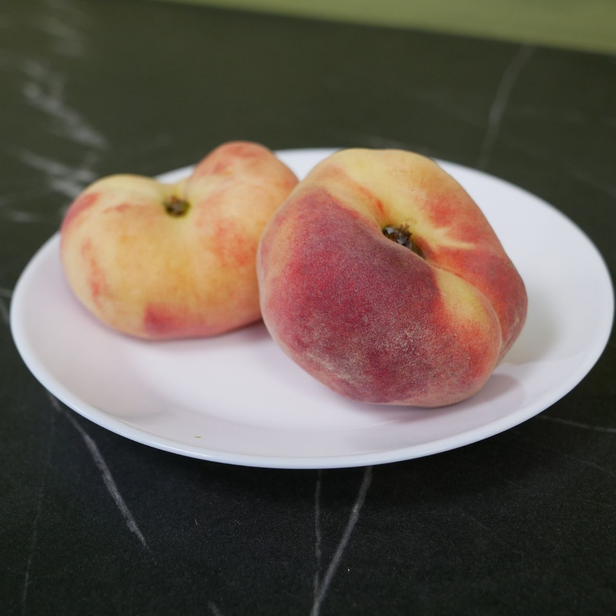 • Tvar – zřetelně zploštělý, typický pro ploché broskve;