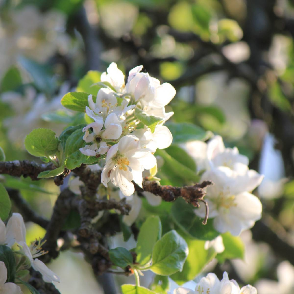 Květy se objevují ve středním termínu — zpravidla od konce dubna do prvních květnových dnů — a zaujmou velikostí i sněhově bílými lístky, které mají v poupatech jemný růžový nádech. V plném květu vypadají větve jako pokryté lehkým oblakem a sladká vůně láká včely i čmeláky. Odrůda je cizosprašná, a proto potřebuje blízkost jabloní kvetoucích ve stejném období. Velmi dobře spolupracuje s odrůdami Freedom, Golden Delicious, Idared, Cortland a Gala. V praxi postačí jedna vhodná odrůda v okolí — klidně i na sousedním pozemku — aby zajistila bohaté a rovnoměrné nasazování plodů.