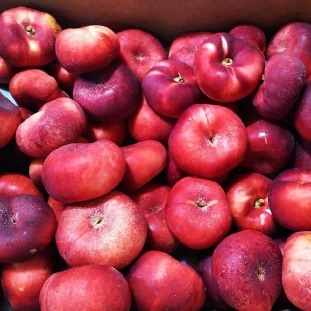 • Vzhled plodů – plody mají charakteristický zploštělý tvar, připomínající broskve typu UFO, avšak s hladkou, lesklou slupkou typickou pro nektarinky.